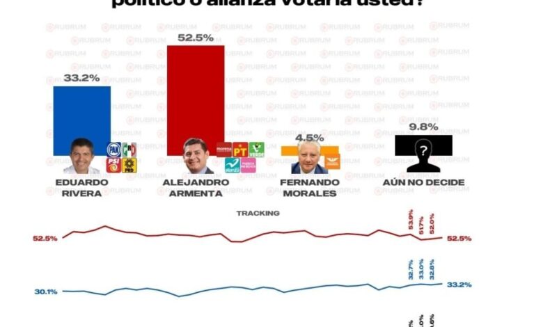 Armenta lidera preferencia electoral en Puebla según encuesta RUBRUM. A menos de 3 semanas de la jornada electoral, Alejandro Armenta, candidato de la coalición Sigamos Haciendo Historia (Morena, PT, PVEM, PANAL, FXM), se coloca el frente en la preferencia electoral con un 52.5 por ciento, frente al abanderado opositor.