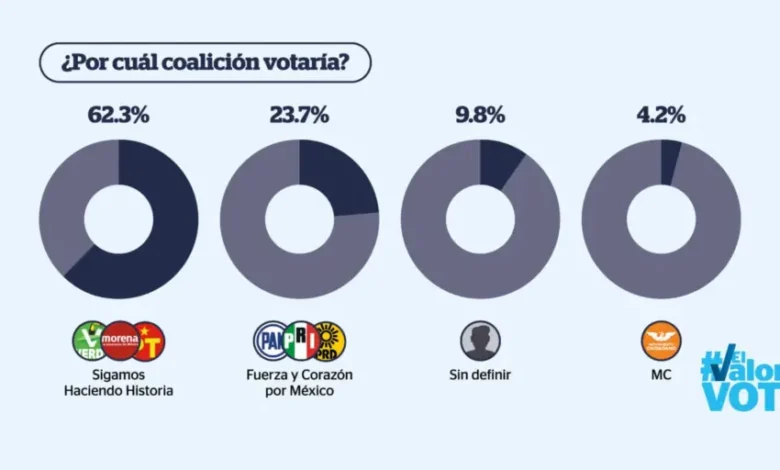 Asegura Sigamos Haciendo Historia la contienda electoral con un margen del 62.3 por ciento sobre la alianza de los partidos Acción Nacional (PAN), Revolucionario Institucional (PRI), de la Revolución Democrática (PRD) y Social de Integración (PSI), que cuenta con un 23.7 por ciento; mientras que el 4.2 por ciento es para Movimiento Ciudadano (MC), y el 9.8 por ciento aún no define su voto.