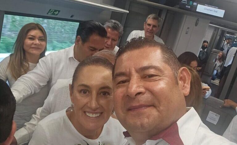 El gobernador electo de Puebla, Alejandro Armenta, asistió al recorrido a bordo de los vagones del Tren Maya que encabezan el presidente y la presidenta electa